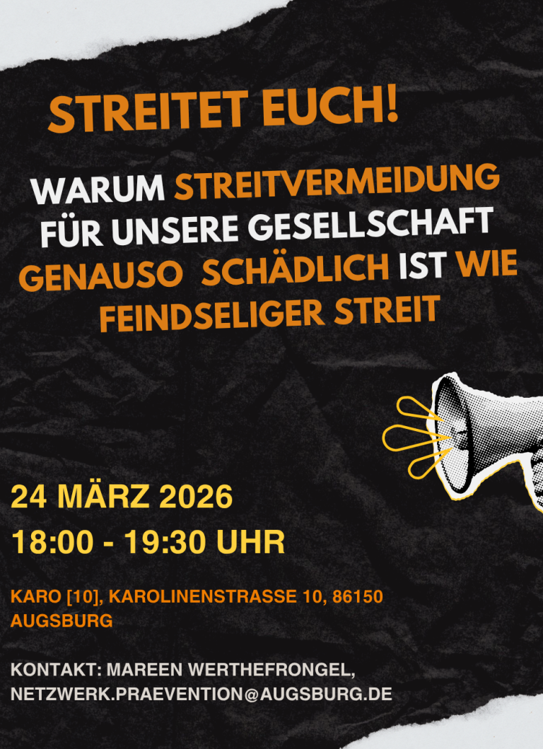 Ich studiere derzeit im Master Erziehungswissenschaft an der Universität Augsburg. Spätestens im Rahmen meines Studiums ist mir die Wichtigkeit einer demokratischen Gesprächsführung und Streitkultur bewusst geworden. Daher engagiere ich mich im Projekt STREIT/FÖRDERER: Ich möchte meinen Teil dazu beitragen, dass Menschen konstruktiv streiten lernen. Das stärkt unsere Demokratie, weil in einem konstruktiven Streit keine Meinungen und Ansichten überhört oder ausgeschlossen werden.